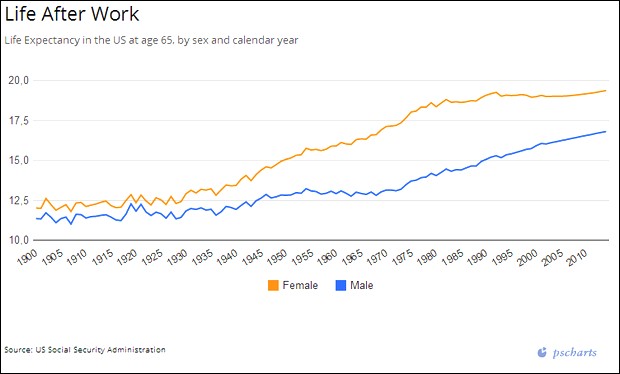 Mas, a reforma mais importante para estabilizar o financiamento dos benefícios de pensão da Previdência Social é ajustá-los segundo o aumento da expectativa de vida. Quando os EUA criaram o programa de Previdência Social na década de 1930, a legislação especificou que os benefícios seriam pagos aos aposentados com 65 anos de idade. A expectativa de vida à idade de 65 anos cresceu a partir desse momento, aproximadamente um ano por década. Hoje, a expectativa de vida é seis anos maior que em 1940 e o aumento do número de anos de aposentadoria criou problemas financeiros à Previdência Social.
