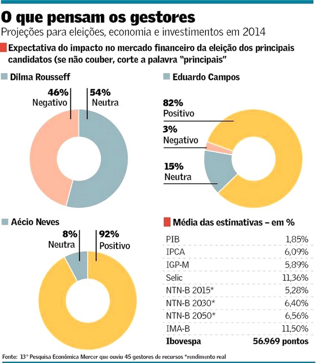 A consultoria de investimentos Mercier1 perguntou a 45 gestores que juntos administram R$ 10,8 trilhões no mundo qual seria o impacto no mercado financeiro da eleição dos principais candidatos a Presidente: Dilma Roussef (PT), Aécio Neves (PSDB) e Eduardo Campos (PSB). Caso Dilma fosse reeleita o impacto sobre o mercado financeiro seria negativo para 48% dos entrevistados. Por outro lado, a vitória de Aécio Neves ou de Eduardo Campos seria considerada positiva para o mercado financeiro para 92% e 82% dos participantes da pesquisa, respectivamente.