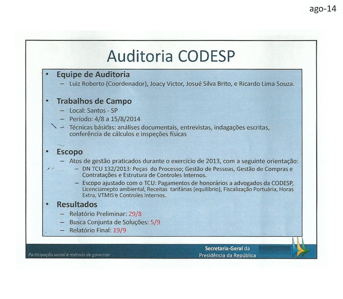Com atribuições de órgão seccional de correição, tendo como área de atuação os órgãos integrantes, agências reguladoras e empresas estatais ligadas diretamente à Presidência da República, inclusive as suas entidades vinculadas ou supervisionadas, a Secretaria de Controle Interno da Presidência da República (CISET/PR) está realizando auditoria nas contas 2013 da CODESP.