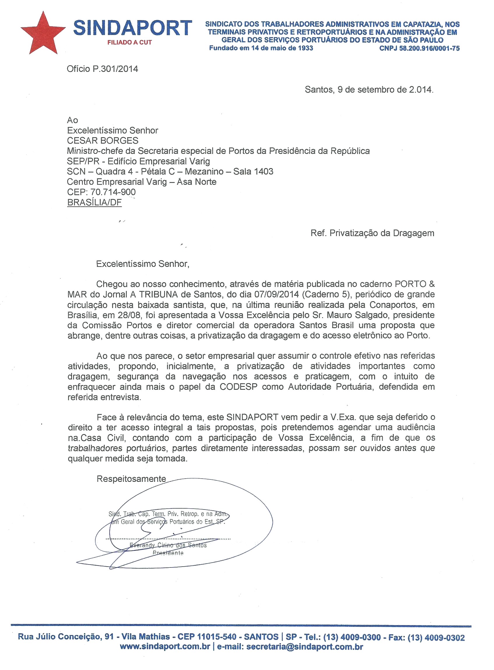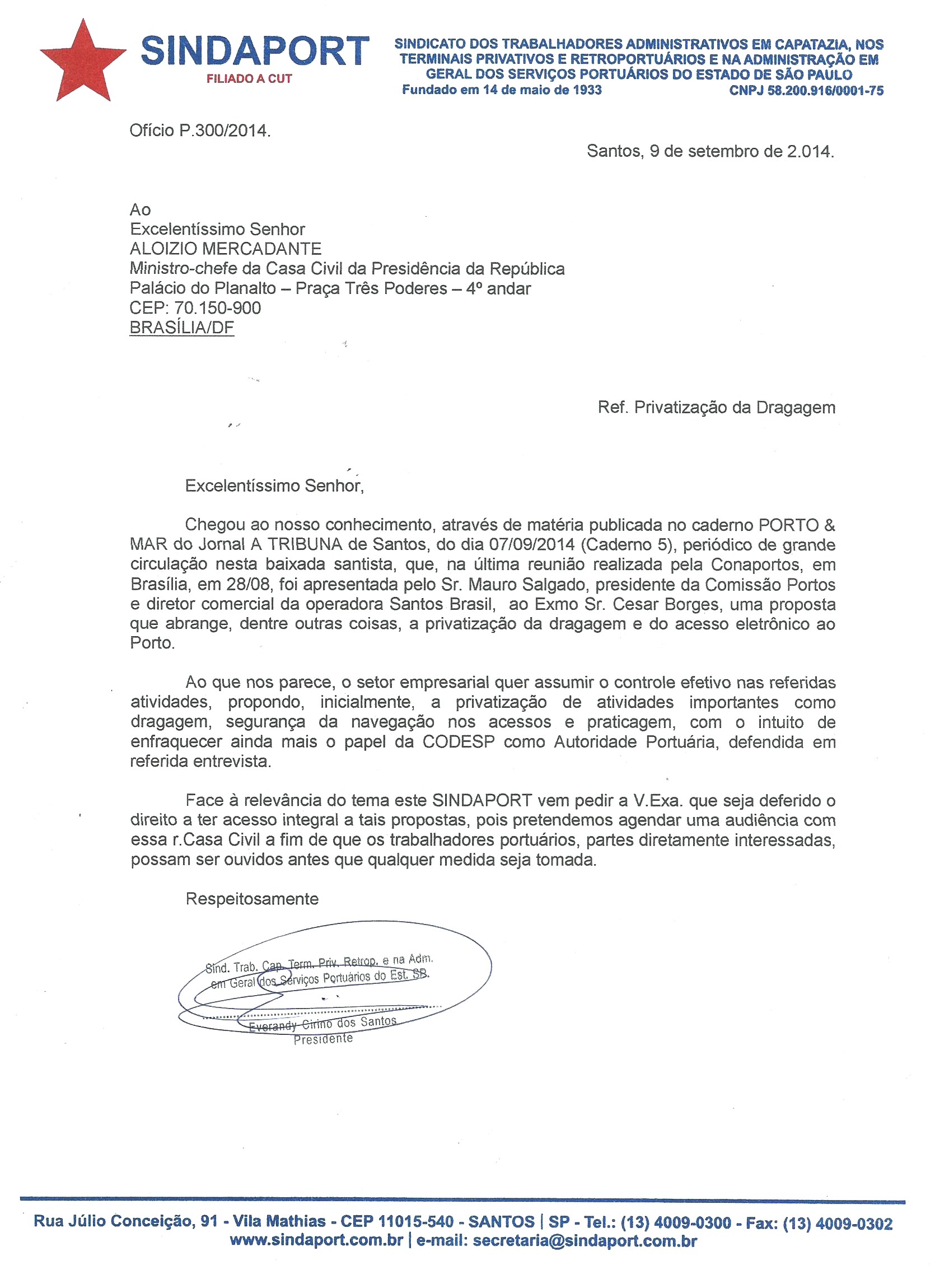 Já encaminhamos ofícios para a Casa Civil e SEP solicitando uma cópia desta proposta empresarial de privatização da dragagem, já entregue ao ministro César Borges, no dia 28 de agosto, durante reunião da Comissão Nacional das Autoridades Portuárias (CONAPORTOS), em Brasília.