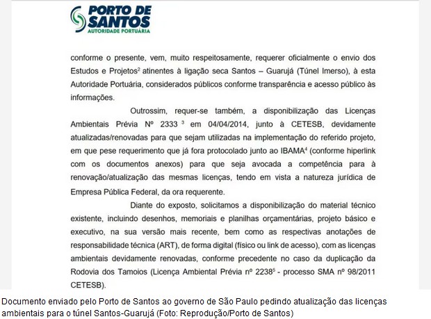 No governo federal, também há um debate interno de que, para obras compreendidas na poligonal do porto (entre a perimetral de Santos e a do Guarujá com o canal no interior), a competência para as licenças ambientais seria do Ibama, em especial quando envolve elevado volume de dragagem como a proposta para construção do túnel. No ofício enviado à Cetesb, embora peça a disponibilização das licenças ambientais prévias, a autoridade portuária complementa: “em que pese requerimento que já fora protocolado junto ao Ibama para que seja avocada a competência para a renovação/atualização das mesmas licenças, tendo em vista a natureza jurídica de empresa pública federal, da ora requerente”.