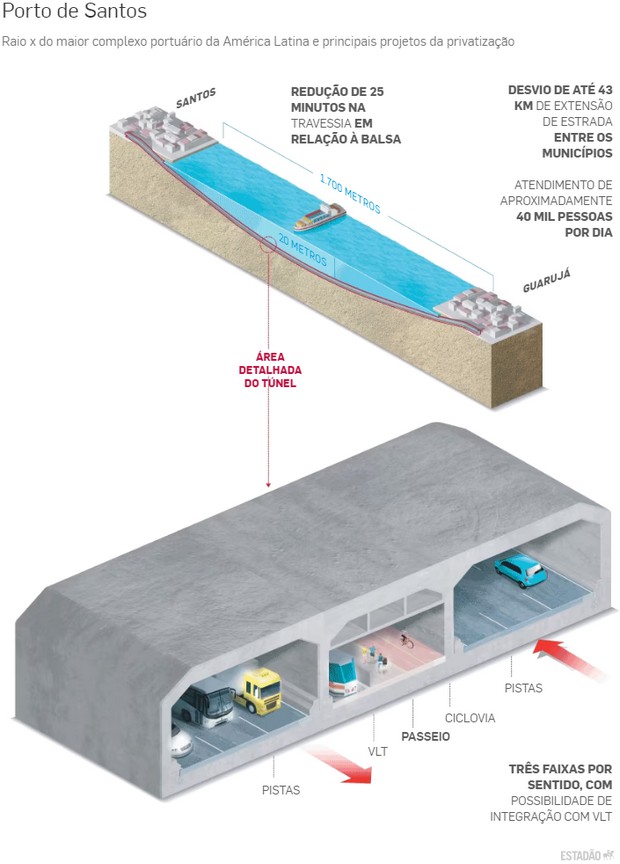 A construção de uma ligação seca entre Santos e Guarujá é uma demanda antiga da região. Hoje, o caminho entre as duas cidades é feito por estrada, em um trecho de 43 quilômetros de extensão. Outra opção dos motoristas é cruzar os municípios por meio de uma balsa, que demanda um tempo de espera variável a depender das condições climáticas e do fluxo de veículos. Já o túnel submerso terá apenas 1,7 quilômetro de extensão, resolvendo o gargalo de mobilidade entre as duas cidades. Para isso, teria que ser construído em uma profundidade de 20 metros no canal de Santos. Seria o suficiente para não comprometer o tráfego de navios no local, onde o calado chegará a no máximo 17 metros. Atualmente, a profundidade é de 15 metros. O túnel teria três faixas por sentido, além de uma integração com veículo sob trilhos (VLT), ciclovia e passagem urbana. Estima-se que a travessia submersa seria utilizada por aproximadamente 40 mil pessoas por dia e poderia reduzir em 25 minutos o tempo de viagem em relação à opção por balsa.
