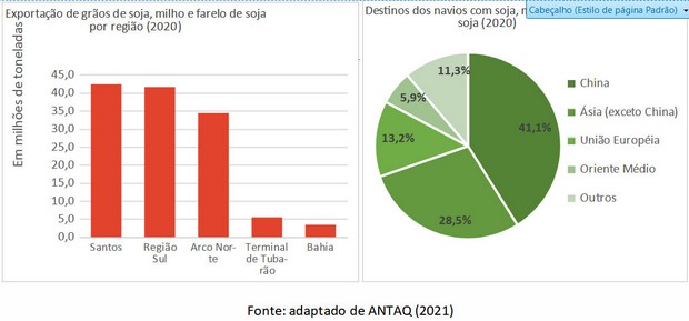 As exportações de grãos de soja, milho e farelo de soja pelos portos marítimos brasileiros, em 2020, totalizaram 127,4 milhões de toneladas, de acordo com o Estatístico Aquaviário da ANTAQ, o equivalente a 24,5% do volume total de granéis sólidos exportados (minério de ferro representou 64,8%). Desse total de grãos e farelo exportados, 33,2% foram embarcados em Santos; 32,7% em portos da Região Sul; 27,0% no Arco Norte; 4,3% no Terminal de Tubarão; e 2,7% na Bahia.