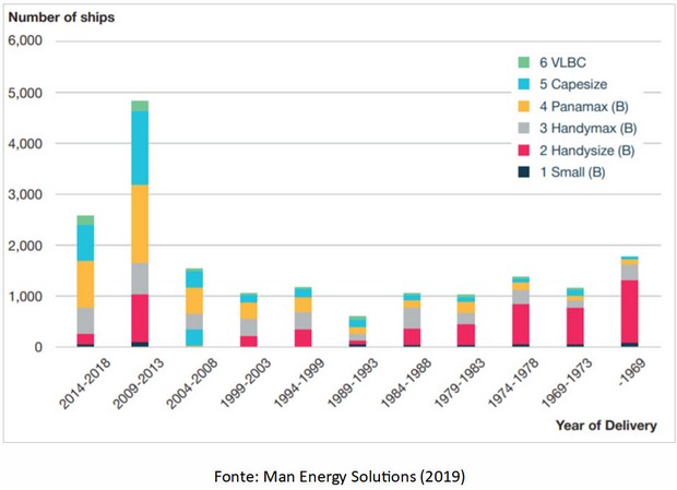 A carteira de encomendas global de navios graneleiros revela um movimento acelerado de crescimento das dimensões do perfil dessas embarcações nos próximos anos, observando-se uma participação nas encomendas de 37% de navios Capesize e 16% de navios VLOC, contra uma participação de 27,9% de navios Panamax (MAN ENERGY SOLUTIONS, 2019). Este crescimento evidencia-se especialmente da década de 90 em diante, a partir de quando passaram a ser entregues mais navios das classes Panamax e Capesize do que as até então predominantes Handysize e Handymax, conforme evidencia o gráfico a seguir.