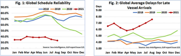 • Integridade de schedule: enquanto houver atrasos dos navios, cancelamentos de escalas e rolagens de carga, significa que ainda há backlog em alguma parte do mundo. Os gráficos seguintes são do último levantamento global realizado pela SeaIntel e demonstram o tamanho da deterioração dos serviços regulares no último ano (em breve a SOLVE passará a divulgar algo semelhante para serviços relacionados ao Brasil);