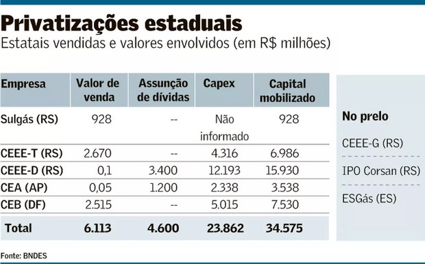 Além do saneamento, com sua primeira grande onda de capital privado, chama atenção o apoio do BNDES à venda de empresas estaduais. Somando os valores de compra, assunção de dívidas e investimentos obrigatórios, chega-se à marca de R$ 34,5 bilhões em capital mobilizado (como mostra o gráfico abaixo).