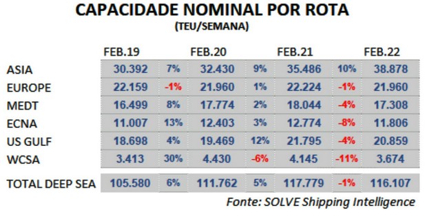 Diante dessa situação, não é raro ouvir pelo mercado ruídos de que os armadores estariam “escondendo capacidade” por aqui para aumentar os fretes. Porém, a exemplo do que se observou em todo o mundo, em 2020 e 2021 o incremento da capacidade nominal nas rotas de/para o Brasil ficou bastante em linha ou até mesmo acima do crescimento da demanda. A questão será 2022!
