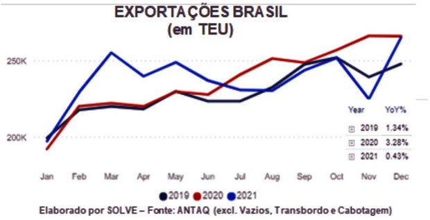 Evidente que parte do crescimento da demanda no Brasil e no mundo foi “represado” pela mencionada escassez de navios/contêineres parados em congestionamentos, o que está, inclusive, atipicamente sustentando por mais esse início de ano as boas taxas de utilizações dos navios.