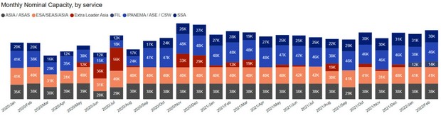 O gráfico seguinte, que demonstra a evolução mensal da capacidade nominal na rota Brasil<>Ásia (já abatendo os Blank Sailings e somando os Extraloaders) demonstra claramente que não houve redução estrutural na capacidade e, portanto, essa sensação de que os armadores estariam “escondendo capacidade” se deu por conta das viagens canceladas por atrasos e, principalmente, pela menor disponibilidade de extraloaders (em vermelho) observados em 2021, quando comparado a 2020.