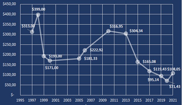 Gráfico de Evolução do Box Rate em USD/contêiner (1997 a 2021)