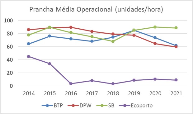 Quanto à produtividade da movimentação de contêineres, os dados da ANTAQ (Agência Nacional de Transportes Aquaviários) sobre a prancha média operacional (unidades de contêineres movimentados por hora em cada terminal) no gráfico a seguir ilustra bem que os três maiores terminais (BTP, DP World e Santos Brasil) competiram com níveis similares de produtividade nos últimos 7 anos. A eficiência operacional certamente melhorou quando novos investimentos em portêineres foram realizados, o que explica algumas oscilações da produtividade em cada terminal ao longo dos anos.