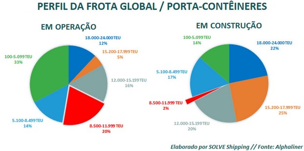 Atualmente predominam nos principais tráfegos de e para o Brasil os navios de 8 a 12 mil TEU, com comprimento de 305 a 330 metros, porém essa classe de navios deve desaparecer dos oceanos nos próximos 5 a 10 anos (pois praticamente não há encomendas para esse tipo de embarcação), justamente em virtude da ineficiência energética de navios desse porte (grandes demais para rotas regionais, feeder e cabotagem, porém ineficientes nas rotas longas), conforme demonstrado no gráfico seguinte: