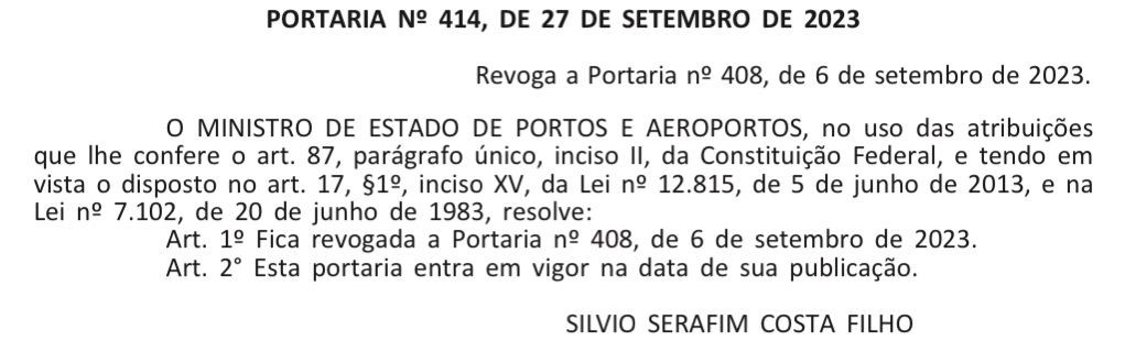 O ministro de Portos e Aeroportos, Silvio Costa Filho, revogou a portaria publicada no dia 6 de setembro que vedava a terceirização de atividades de segurança e vigilância nas Companhias Docas Federais. A decisão foi anunciada no último sábado, dia 30.