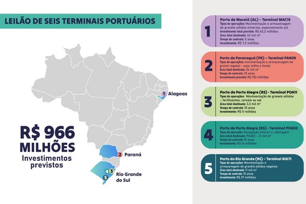 O arrendamento do terminal POA02, uma das áreas do Porto de Porto Alegre (RS), foi vencido pela empresa Serra Morena Corretora, arrematada por R$ 2 mil. O contrato tem prazo de dez anos e previsão de investimentos de R$ 16 milhões. O terminal é voltado à operação de navegação interior e cabotagem, armazenagem e expedição por via hidroviária.