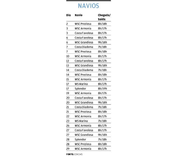 “Os dias de maior movimentação serão aos finais de semana, quando o terminal receberá os navios MSC Grandiosa e Costa Favolosa, aos sábados, e o MSC Preziosa e o Costa Diadema aos domingos, movimentando uma média de 17 mil passageiros por dia”, informou o Concais em nota.