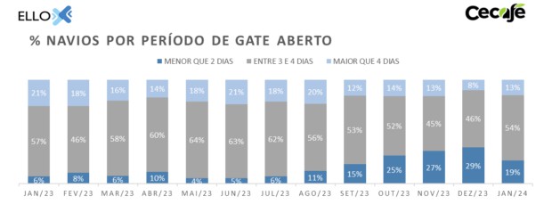 Conforme o Boletim DTZ, também permanecem os problemas relativos à abertura de portão no terminal. No mês passado, apenas 13% dos procedimentos de embarque tiveram prazo superior a quatro dias de gate aberto por navios. Outros 54% possuíram entre três e quatro dias e 19% tiveram menos de dois dias de período de gate aberto.