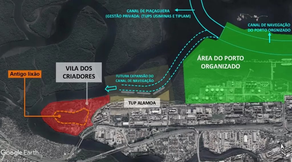 Moradia e meio ambiente – A Vila dos Criadores, com uma área total de 420 mil m2, fica junto ao Rio Casqueiro, no limite do município de Santos com Cubatão, entre o estuário e a Rodovia Anchieta, no bairro Alamoa. No local há uma ocupação irregular, com cerca de 9 mil pessoas, que serão transferidas para residências adequadas, condição que fará parte da contrapartida exigida do futuro arrendatário da última área não explorada da margem direita do Porto.