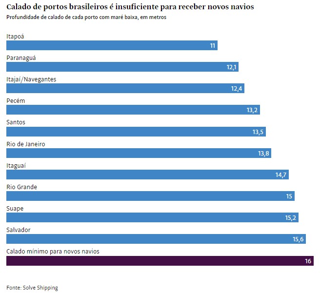 De acordo com um estudo do Centronave (Centro Nacional de Navegação Transatlântica), o país deixa de movimentar cerca de um milhão de toneladas por ano devido à limitação nos calados. A entidade afirma que, em continentes como Europa e Ásia, os portos já têm capacidade para operar embarcações de até 24 mil TEUs.