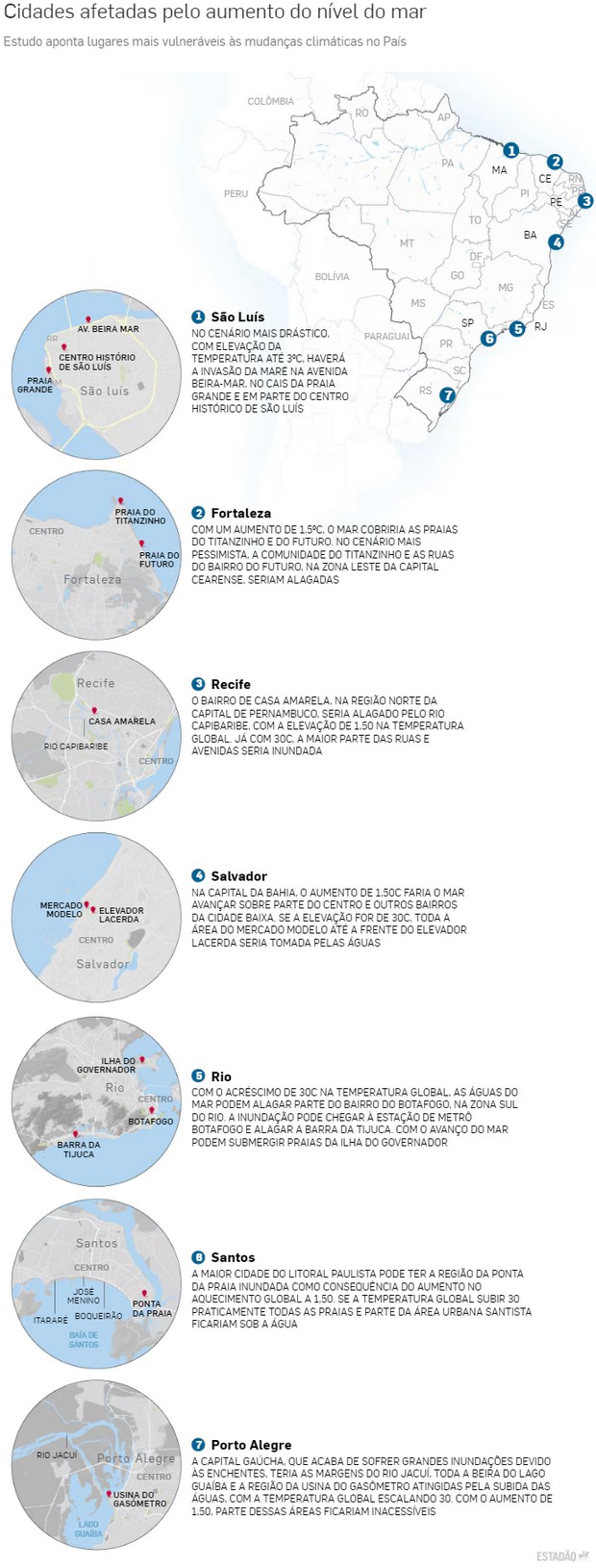 • Além do Rio, estão na lista das cidades ameaçadas as capitais Fortaleza (CE), Salvador (BA), Recife (PE), Porto Alegre (RS), São Luís (MA) e a cidade de Santos, no litoral de São Paulo.