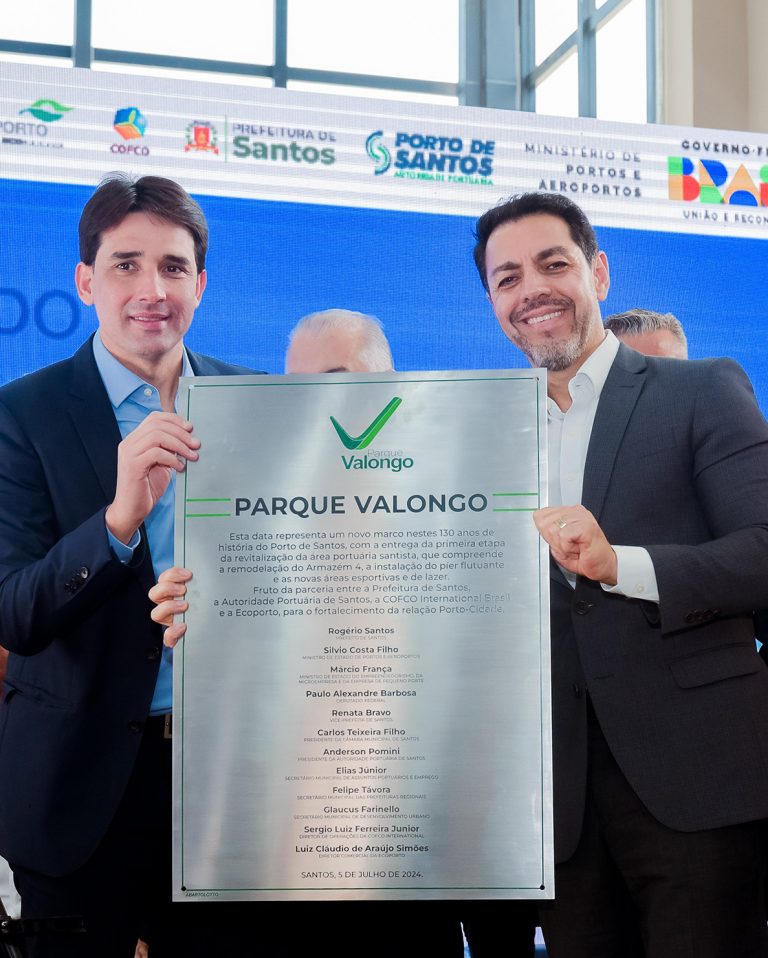 O vice-presidente da República e ministro do Desenvolvimento, Indústria Comércio e Serviços (MDIC) Geraldo Alckmin; o ministro de Portos e Aeroportos, Silvio Costa Filho, o prefeito Rogério Santos e o presidente da Autoridade Portuária de Santos (APS), Anderson Pomini, entregaram, nesta sexta-feira (5/7), para Santos e região, a primeira fase do Parque Valongo, refletindo o compromisso contínuo do Porto de Santos e da administração municipal em investir no bem-estar e na qualidade de vida da população.