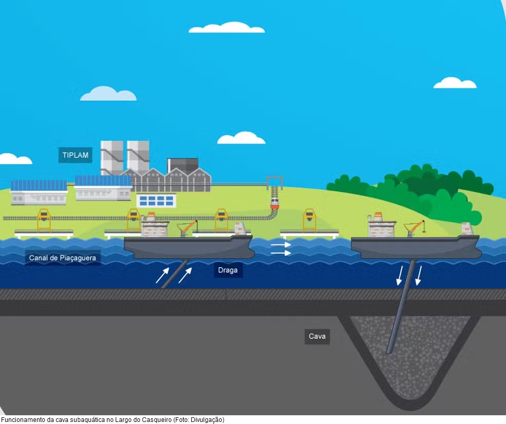 Os sedimentos que estavam no fundo do Canal de Piaçaguera foram transportados até o buraco aberto debaixo d´água, ou seja, a cava permitiu aprofundar o canal.
