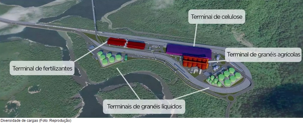 O empreendimento contará com quatro terminais em terra, um para cada tipo de carga: grãos, celulose, combustíveis e fertilizantes. Os produtos serão escoados por cinco berços de atracação de navios, sendo dois para combustíveis, um para grãos, um para celulose e um para fertilizantes.