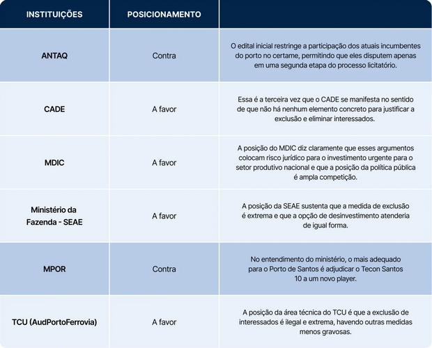 Os argumentos apresentados para a restrição de competidores apontavam inicialmente para possíveis cenários de concentração, e, recentemente, foram acrescentados também posicionamentos de soberania, geopolítica e até menção a políticas públicas, pontos que sequer existiam no início do processo. Diante dos possíveis cenários, todos sem fundamentação técnica, sugerem a necessidade de um novo investidor portuário no estuário de Santos.