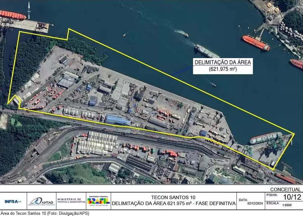 Com investimento estimado em R$ 6,45 bilhões e contrato inicial de 25 anos, renovável por até 70 anos, o Tecon Santos 10 ocupará uma área estratégica de 621,9 mil m² no cais do Saboó, no litoral de São Paulo.