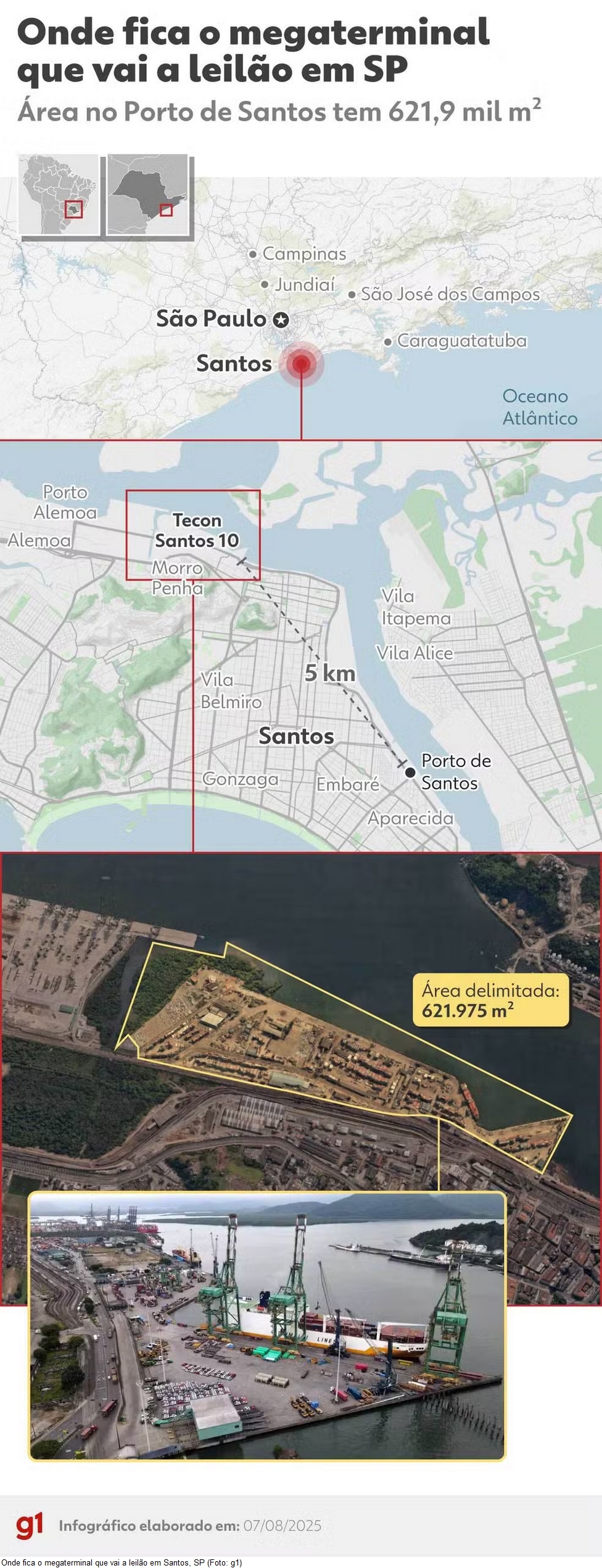 O megaterminal será instalado no Cais do Saboó, na margem direita do Porto de Santos, em uma área de 621.975 m². Ele tem previsão de capacidade estática de 3,5 milhões de TEU, o que é mais que a metade do que foi movimentado no ano passado no cais santista. O investimento estimado é de R$ 6,45 bilhões em 25 anos.